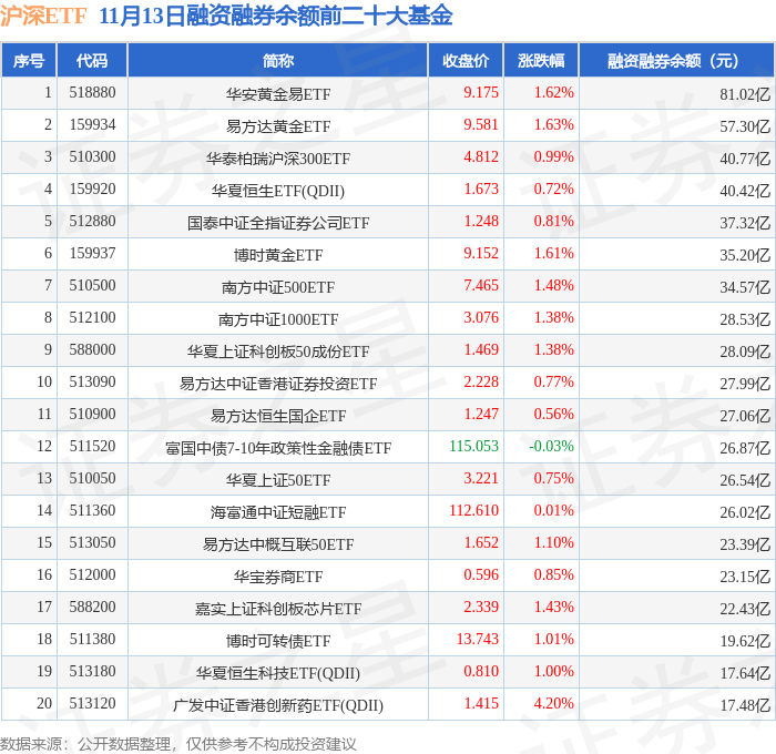 沪深ETF融资融券余额前三分别为:华安黄金易ETF(518880)融资融券余额81.02亿元、易方达黄金ETF(159934)融资融券余额57.3亿元、华泰柏瑞沪深300ETF(510300)融资融券余额40.77亿元,前20具体见下表:
