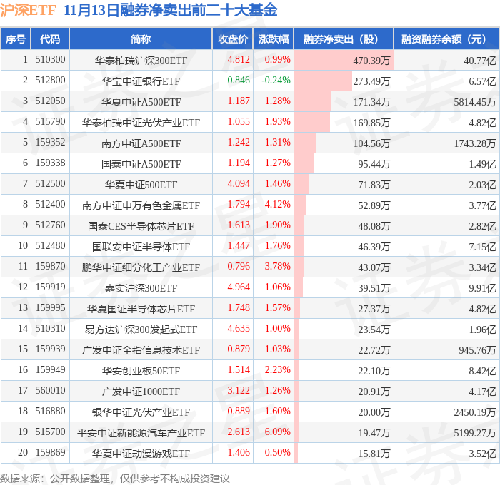 沪深ETF融券净卖出前三分别为:华泰柏瑞沪深300ETF(510300)融券净卖出470.39万股、华宝中证银行ETF(512800)融券净卖出273.49万股、华夏中证A500ETF(512050)融券净卖出171.34万股,前20具体见下表: