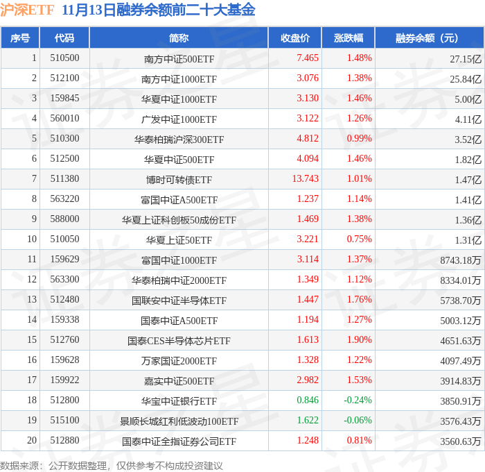 沪深ETF融券余额前三分别为:南方中证500ETF(510500)融券余额27.15亿元、南方中证1000ETF(512100)融券余额25.84亿元、华夏中证1000ETF(159845)融券余额5亿元,前20具体见下表: