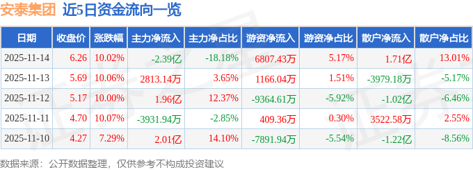 证券之星消息,安泰集团11月14日涨停收盘,收盘价6.26元。该股于9点30分涨停,10次打开涨停,截止收盘封单资金为9369.48万元,占其流通市值1.49%。