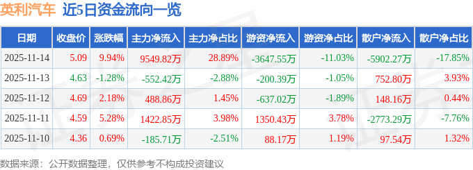 11月14日的资金流向数据方面,主力资金净流入9549.82万元,占总成交额28.89%,游资资金净流出3647.55万元,占总成交额11.03%,散户资金净流出5902.27万元,占总成交额17.85%。
