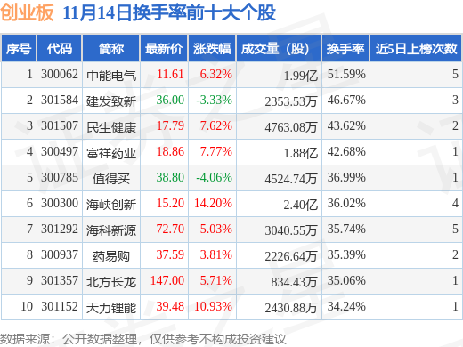 当日创业板换手率前10大个股中8只个股收涨,平均涨幅7.67%,其中中能电气(300062)以换手率51.59%排第一,6只个股近5个交易日中多次上榜。