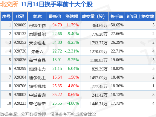 当日北交所换手率前10大个股中4只个股收涨,平均涨幅4.71%,其中丹娜生物(920009)以换手率50.65%排第一,9只个股近5个交易日中多次上榜。