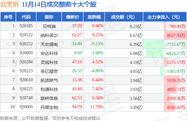 当日北交所成交额前10大个股中7只个股收涨,平均涨幅6.57%,其中贝特瑞(920185)以成交额8.23亿元排第一。从主力资金流入看,成交额前10大个股中有7只个股呈现主力资金净流入。