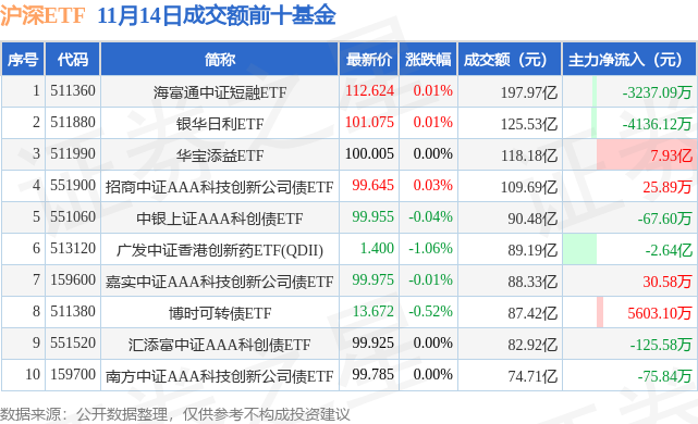 当日沪深ETF成交额前10大ETF基金中3只ETF基金收涨,平均涨幅0.02%,其中短融ETF(511360)以成交额197.97亿元排第一。从主力资金流入看,成交额前10大ETF基金中有4只ETF基金呈现主力资金净流入。