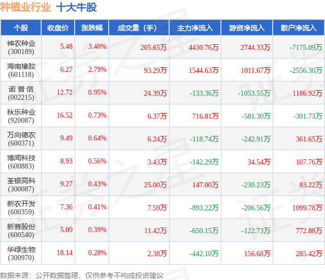 个股表现方面,种植业行业当日领涨股为神农种业(300189),该股当日报收5.48,上涨3.4%,成交量205.65万,主力资金净流入4430.76万元。海南橡胶(601118)以上涨2.79%紧随其后,该股当日成交量93.29万,主力资金净流入1544.63万元。除此之外,诺 普 信(002215)、秋乐种业(920087)、万向德农(600371)均进入当日牛股之列。具体个股列表见下表: