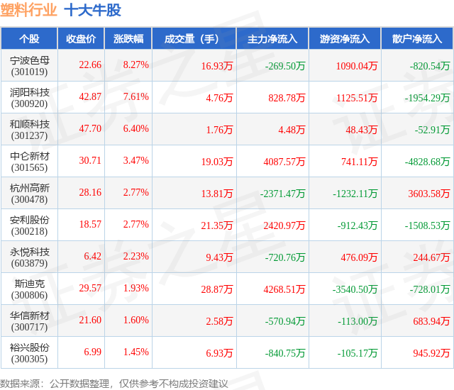 个股表现方面,塑料行业当日领涨股为宁波色母(301019),该股当日报收22.66,上涨8.27%,成交量16.93万,主力资金净流出269.5万元。润阳科技(300920)以上涨7.61%紧随其后,该股当日成交量4.76万,主力资金净流入828.78万元。除此之外,和顺科技(301237)、中仑新材(301565)、杭州高新(300478)均进入当日牛股之列。具体个股列表见下表: