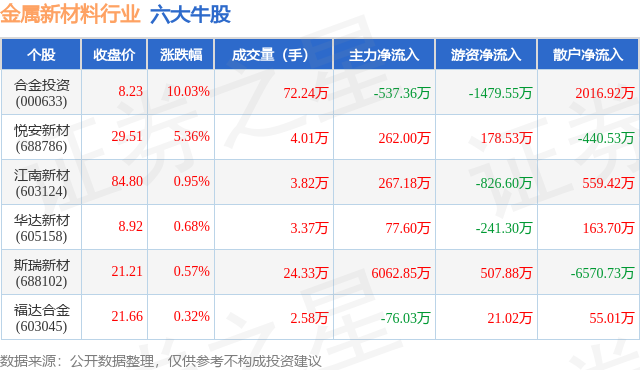 个股表现方面,金属新材料行业当日领涨股为合金投资(000633),该股当日报收8.23,上涨10.03%,成交量72.24万,主力资金净流出537.36万元。悦安新材(688786)以上涨5.36%紧随其后,该股当日成交量4.01万,主力资金净流入262.0万元。除此之外,江南新材(603124)、华达新材(605158)、斯瑞新材(688102)均进入当日牛股之列。具体个股列表见下表: