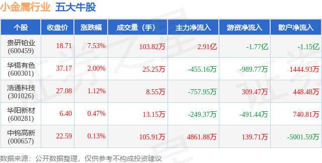 个股表现方面,小金属行业当日领涨股为贵研铂业(600459),该股当日报收18.71,上涨7.53%,成交量103.82万,主力资金净流入2.91亿元。华锡有色(600301)以上涨2.0%紧随其后,该股当日成交量25.25万,主力资金净流出455.16万元。除此之外,浩通科技(301026)、华阳新材(600281)、中钨高新(000657)均进入当日牛股之列。具体个股列表见下表: