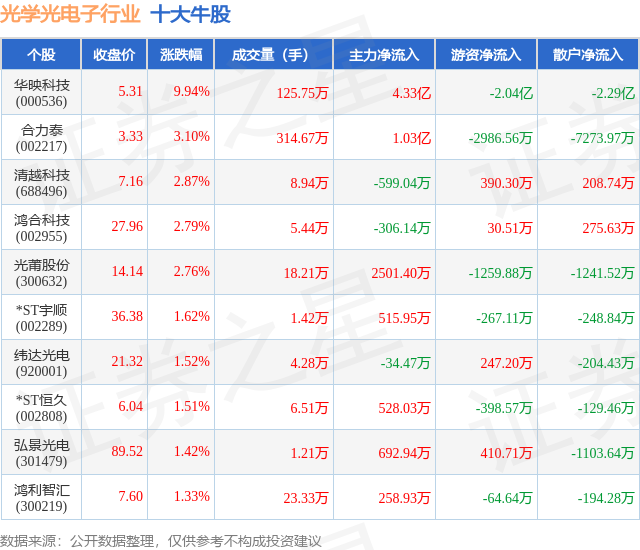 个股表现方面,光学光电子行业当日领涨股为华映科技(000536),该股当日报收5.31,上涨9.94%,成交量125.75万,主力资金净流入4.33亿元。合力泰(002217)以上涨3.1%紧随其后,该股当日成交量314.67万,主力资金净流入1.03亿元。除此之外,清越科技(688496)、鸿合科技(002955)、光莆股份(300632)均进入当日牛股之列。具体个股列表见下表: