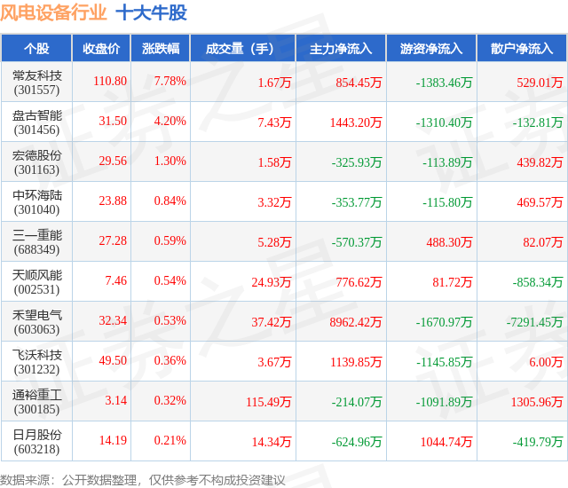 个股表现方面,风电设备行业当日领涨股为常友科技(301557),该股当日报收110.8,上涨7.78%,成交量1.67万,主力资金净流入854.45万元。盘古智能(301456)以上涨4.2%紧随其后,该股当日成交量7.43万,主力资金净流入1443.2万元。除此之外,宏德股份(301163)、中环海陆(301040)、三一重能(688349)均进入当日牛股之列。具体个股列表见下表:
