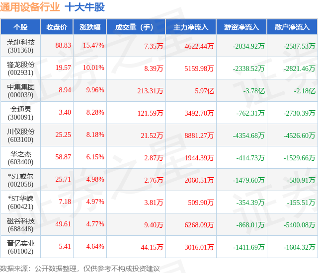 个股表现方面,通用设备行业当日领涨股为荣旗科技(301360),该股当日报收88.83,上涨15.47%,成交量7.35万,主力资金净流入4622.44万元。锋龙股份(002931)以上涨10.01%紧随其后,该股当日成交量8.39万,主力资金净流入5159.98万元。除此之外,中集集团(000039)、金通灵(300091)、川仪股份(603100)均进入当日牛股之列。具体个股列表见下表: