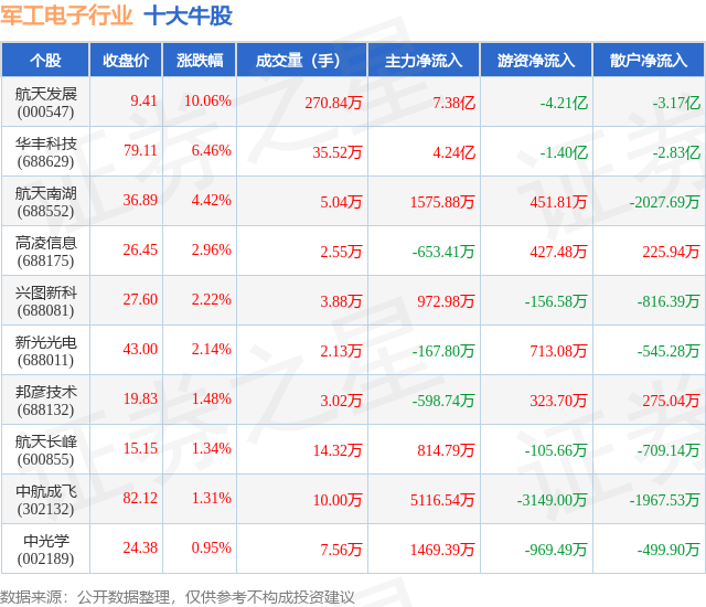个股表现方面,军工电子行业当日领涨股为航天发展(000547),该股当日报收9.41,上涨10.06%,成交量270.84万,主力资金净流入7.38亿元。华丰科技(688629)以上涨6.46%紧随其后,该股当日成交量35.52万,主力资金净流入4.24亿元。除此之外,航天南湖(688552)、高凌信息(688175)、兴图新科(688081)均进入当日牛股之列。具体个股列表见下表: