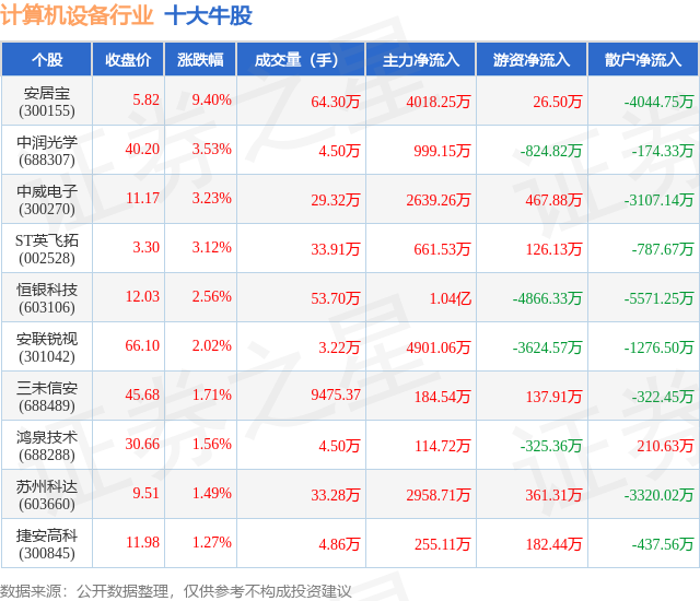 个股表现方面,计算机设备行业当日领涨股为安居宝(300155),该股当日报收5.82,上涨9.4%,成交量64.3万,主力资金净流入4018.25万元。中润光学(688307)以上涨3.53%紧随其后,该股当日成交量4.5万,主力资金净流入999.15万元。除此之外,中威电子(300270)、ST英飞拓(002528)、恒银科技(603106)均进入当日牛股之列。具体个股列表见下表:
