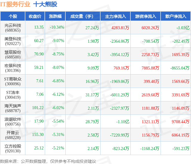 个股表现方面,IT服务行业当日领跌股为光云科技(688365),该股当日报收13.35,下跌10.34%,成交量27.24万,主力资金净流入4283.81万元。美登科技(920227)以下跌9.07%紧随其后,该股当日成交量1.98万,主力资金净流出2364.06万元。除此之外,慧辰股份(688500)、宏景科技(301396)、ST易联众(300096)均进入当日熊股之列。具体个股列表见下表: