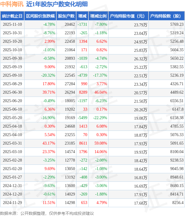 从股价来看,2025年10月31日至2025年11月10日,中科海讯区间跌幅为4.78%,在此期间股东户数减少1731.0户,减幅为7.8%。