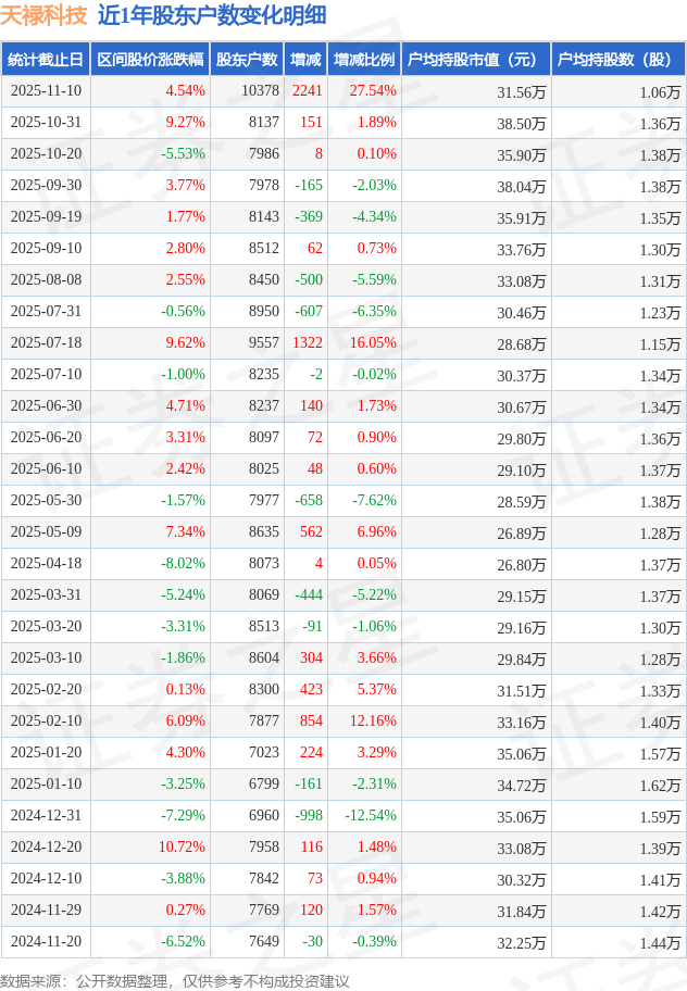 从股价来看,2025年10月31日至2025年11月10日,天禄科技区间涨幅为4.54%,在此期间股东户数增加2241.0户,增幅为27.54%。