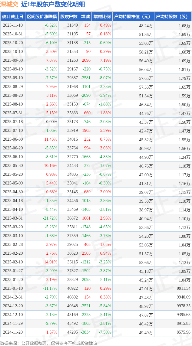 从股价来看,2025年10月31日至2025年11月10日,深城交区间跌幅为6.52%,在此期间股东户数增加154.0户,增幅为0.49%。
