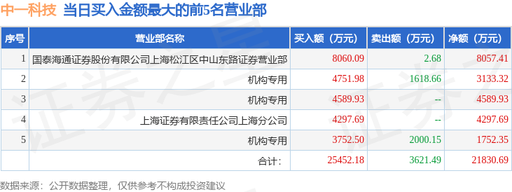 从龙虎榜公布的当日买卖数据来看,机构合计净买入1.13亿元。上海中山东路、小棉袄等知名游资榜上有名。(知名游资上海中山东路一般指国泰海通证券股份有限公司上海松江区中山东路证券营业部席位、知名游资小棉袄一般指上海证券有限责任公司上海分公司席位,根据市场资料整理,仅供参考)