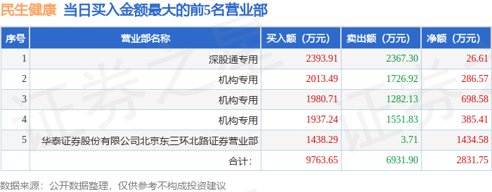 证券之星消息,沪深交易所2025年11月14日公布的交易公开信息显示,民生健康(301507)因日换手率达到30%的前5只证券登上龙虎榜。此次是近5个交易日内第1次上榜。