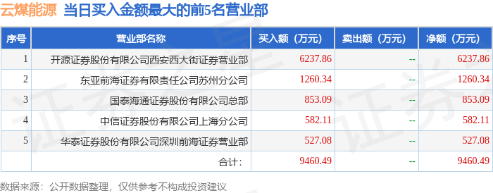 证券之星消息,沪深交易所2025年11月14日公布的交易公开信息显示,云煤能源(600792)因有价格涨跌幅限制的日收盘价格涨幅偏离值达到7%的前五只证券登上龙虎榜。此次是近5个交易日内第1次上榜。