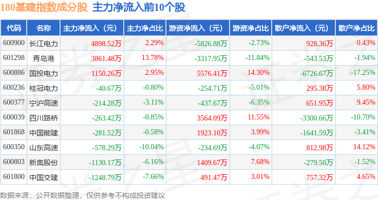 资金流向方面,180基建(000025)指数成份股当日主力资金净流出合计13.0亿元,游资资金净流入合计6.3亿元,散户资金净流入合计6.7亿元。成份股资金流向详情见下表: