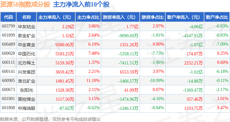 资金流向方面,资源50(000092)指数成份股当日主力资金净流出合计36.41亿元,游资资金净流入合计14.05亿元,散户资金净流入合计22.37亿元。成份股资金流向详情见下表: