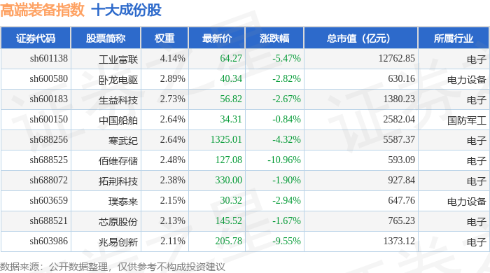 证券之星消息,11月14日,高端装备(000097)指数报收于11309.52点,跌2.43%,成交1338.5亿元,换手率1.71%。当日该指数成份股中,上涨的有10家,隆基绿能以2.72%的涨幅领涨,下跌的有49家,佰维存储以10.96%的跌幅领跌。