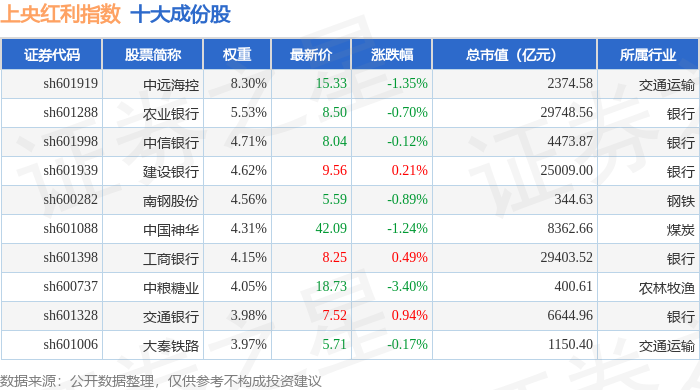 证券之星消息,11月14日,上央红利(000152)指数报收于2994.65点,跌0.6%,成交260.75亿元,换手率0.21%。当日该指数成份股中,上涨的有9家,中远海发以2.21%的涨幅领涨,下跌的有21家,中粮糖业以3.4%的跌幅领跌。