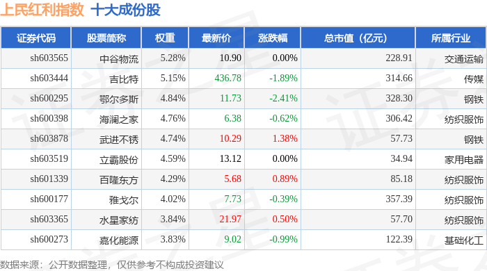 上民红利(000153)指数十大成份股详情如下: