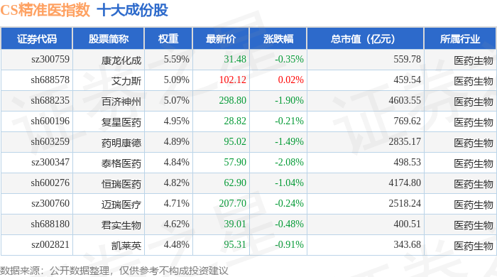 证券之星消息,11月14日,CS精准医(000863)指数报收于2873.56点,跌0.35%,成交176.43亿元,换手率1.45%。当日该指数成份股中,上涨的有17家,成都先导以2.3%的涨幅领涨,下跌的有20家,泰格医药以2.08%的跌幅领跌。