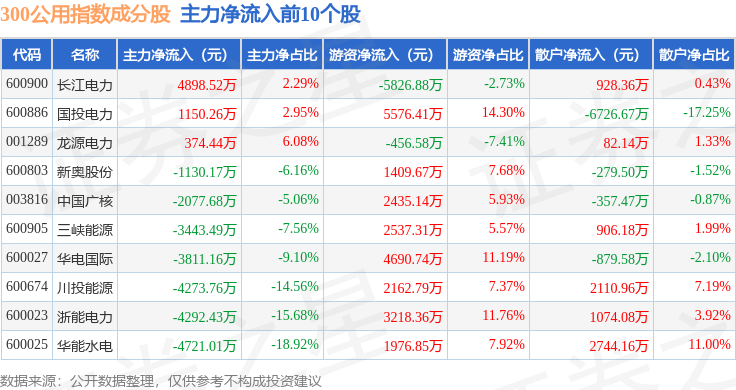 资金流向方面,300公用(000917)指数成份股当日主力资金净流出合计3.68亿元,游资资金净流入合计2.63亿元,散户资金净流入合计1.05亿元。成份股资金流向详情见下表: