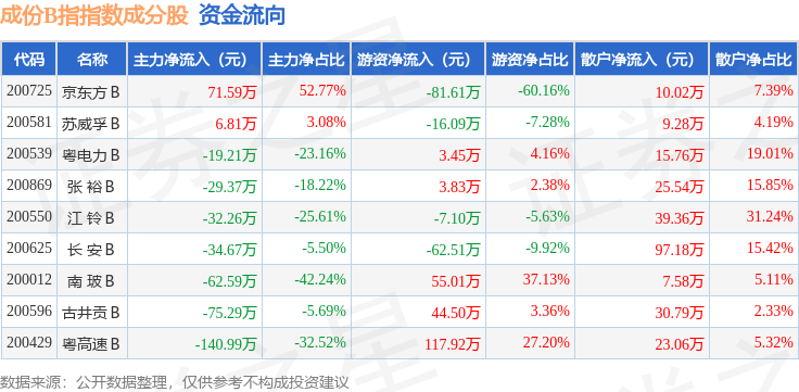 资金流向方面,成份B指(399003)指数成份股当日主力资金净流出合计315.98万元,游资资金净流入合计57.41万元,散户资金净流入合计258.57万元。成份股资金流向详情见下表: