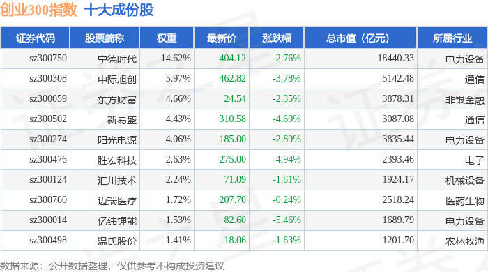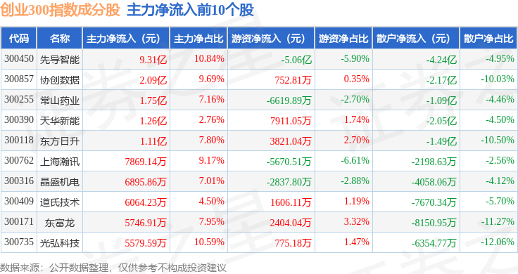 资金流向方面,创业300(399012)指数成份股当日主力资金净流出合计189.03亿元,游资资金净流入合计74.16亿元,散户资金净流入合计114.87亿元。成份股资金流向详情见下表: