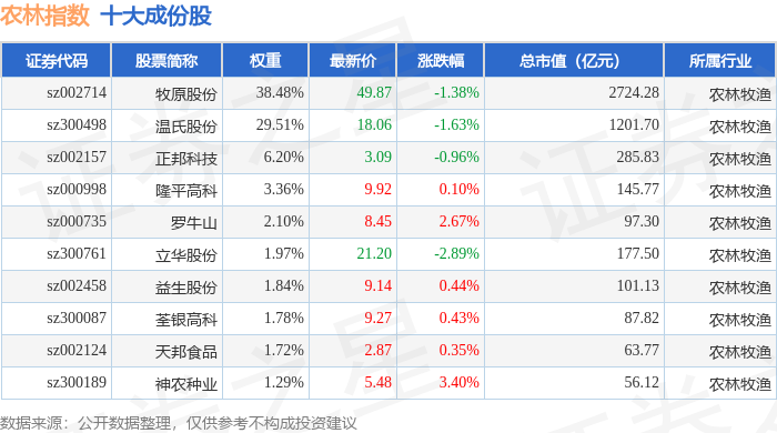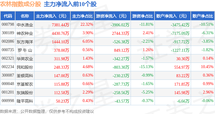 资金流向方面,农林指数(399231)成份股当日主力资金净流出合计8686.05万元,游资资金净流入合计1.25亿元,散户资金净流出合计3812.02万元。成份股资金流向详情见下表: