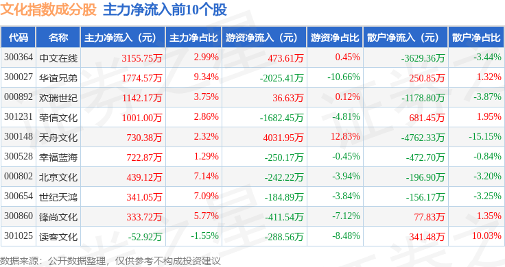 资金流向方面,文化指数(399248)成份股当日主力资金净流出合计2.46亿元,游资资金净流入合计9566.79万元,散户资金净流入合计1.51亿元。成份股资金流向详情见下表: