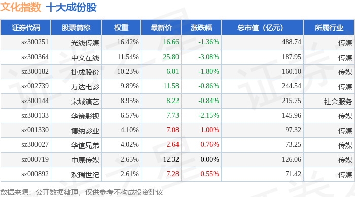 文化指数(399248)十大成份股详情如下: