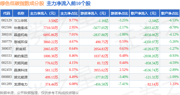 资金流向方面,绿色低碳(399258)指数成份股当日主力资金净流出合计82.5亿元,游资资金净流入合计33.95亿元,散户资金净流入合计48.55亿元。成份股资金流向详情见下表: