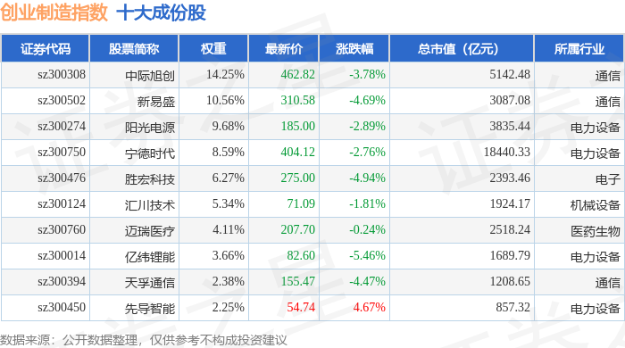 证券之星消息,11月14日,创业制造(399261)指数报收于5876.86点,跌3.1%,成交1222.33亿元,换手率2.72%。当日该指数成份股中,上涨的有4家,先导智能以4.67%的涨幅领涨,下跌的有45家,江波龙以10.77%的跌幅领跌。