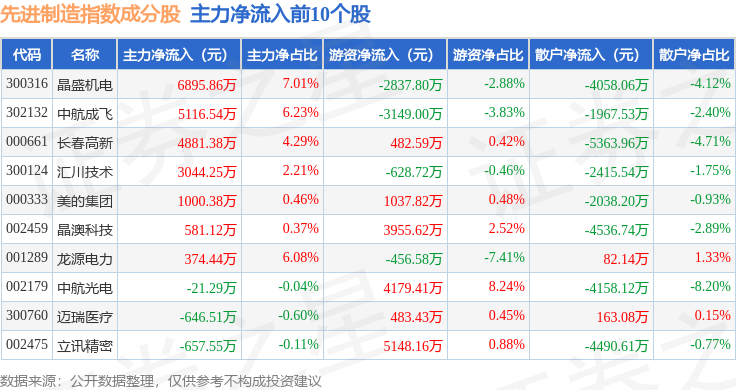 资金流向方面,先进制造(399260)指数成份股当日主力资金净流出合计114.02亿元,游资资金净流入合计50.11亿元,散户资金净流入合计63.91亿元。成份股资金流向详情见下表: