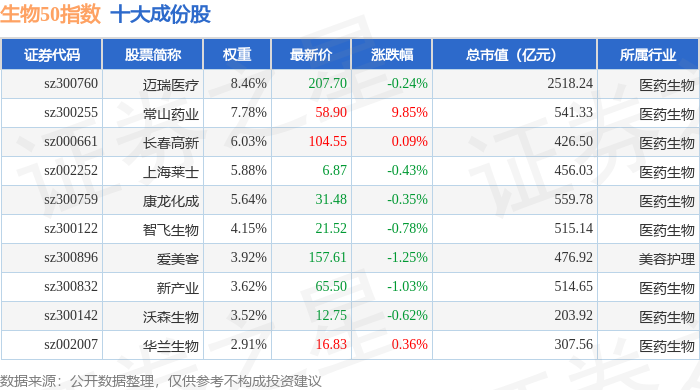 证券之星消息,11月14日,生物50(399280)指数报收于2237.64点,涨0.58%,成交188.65亿元,换手率2.36%。当日该指数成份股中,上涨的有25家,常山药业以9.85%的涨幅领涨,下跌的有24家,宏源药业以7.05%的跌幅领跌。