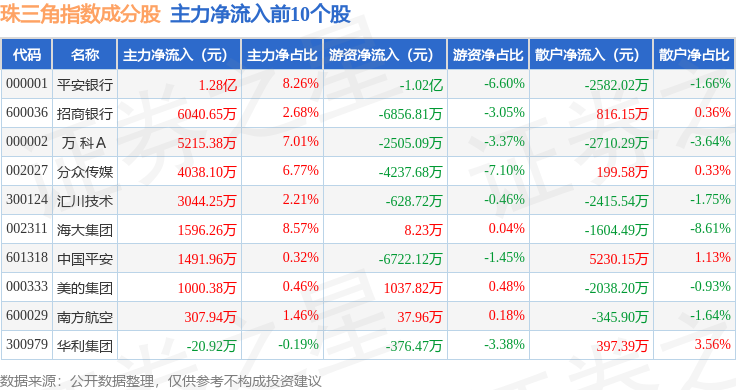 资金流向方面,珠三角(399356)指数成份股当日主力资金净流出合计60.22亿元,游资资金净流入合计18.91亿元,散户资金净流入合计41.31亿元。成份股资金流向详情见下表: