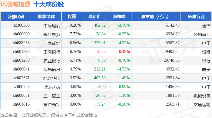 环渤海(399357)指数十大成份股详情如下: