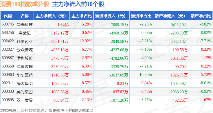 资金流向方面,消费100(399364)指数成份股当日主力资金净流出合计198.49亿元,游资资金净流入合计76.84亿元,散户资金净流入合计121.65亿元。成份股资金流向详情见下表: