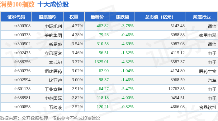 消费100(399364)指数十大成份股详情如下: