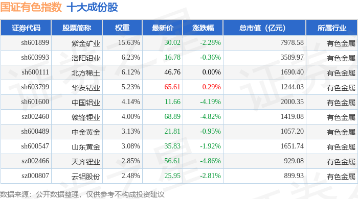 证券之星消息,11月14日,国证有色(399395)指数报收于8895.49点,跌2.05%,成交771.24亿元,换手率2.22%。当日该指数成份股中,上涨的有7家,国城矿业以3.4%的涨幅领涨,下跌的有42家,江特电机以5.17%的跌幅领跌。