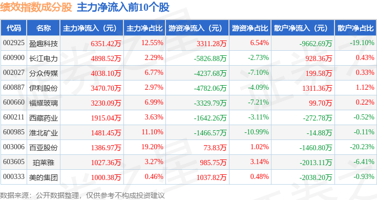 资金流向方面,绩效指数(399398)成份股当日主力资金净流出合计41.13亿元,游资资金净流入合计11.76亿元,散户资金净流入合计29.37亿元。成份股资金流向详情见下表: