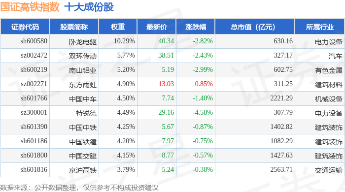 证券之星消息,11月14日,国证高铁(399419)指数报收于2138.12点,跌1.0%,成交163.35亿元,换手率0.98%。当日该指数成份股中,上涨的有18家,天健集团以7.51%的涨幅领涨,下跌的有31家,永贵电器以4.95%的跌幅领跌。