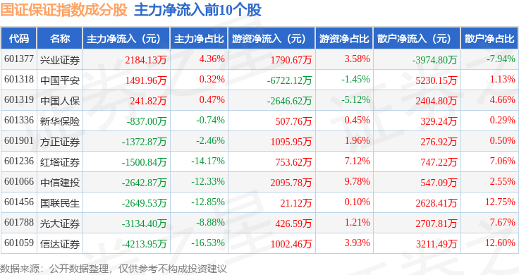 资金流向方面,国证保证(399420)指数成份股当日主力资金净流出合计29.97亿元,游资资金净流入合计10.63亿元,散户资金净流入合计19.35亿元。成份股资金流向详情见下表:
