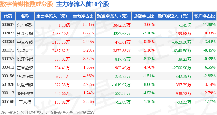 资金流向方面,数字传媒(399434)指数成份股当日主力资金净流出合计27.57亿元,游资资金净流入合计8.71亿元,散户资金净流入合计18.86亿元。成份股资金流向详情见下表: